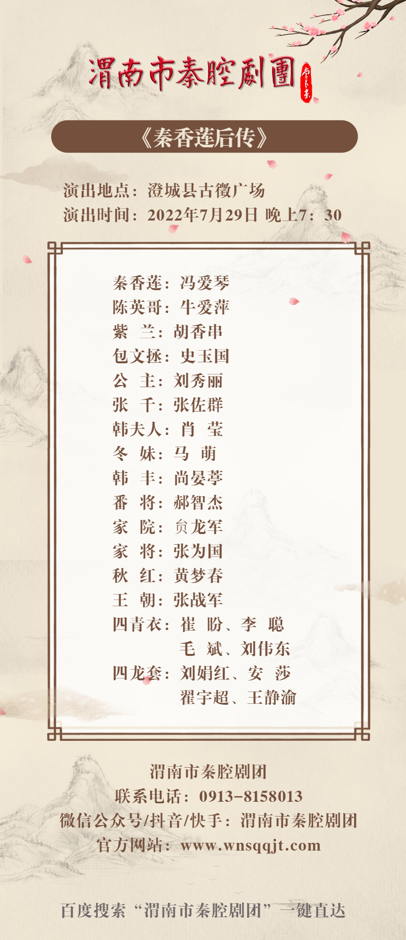 剧团地址:渭南市临渭区草市巷15号 联系电话:15991309888 官方网站:www.wnsqqjt.com