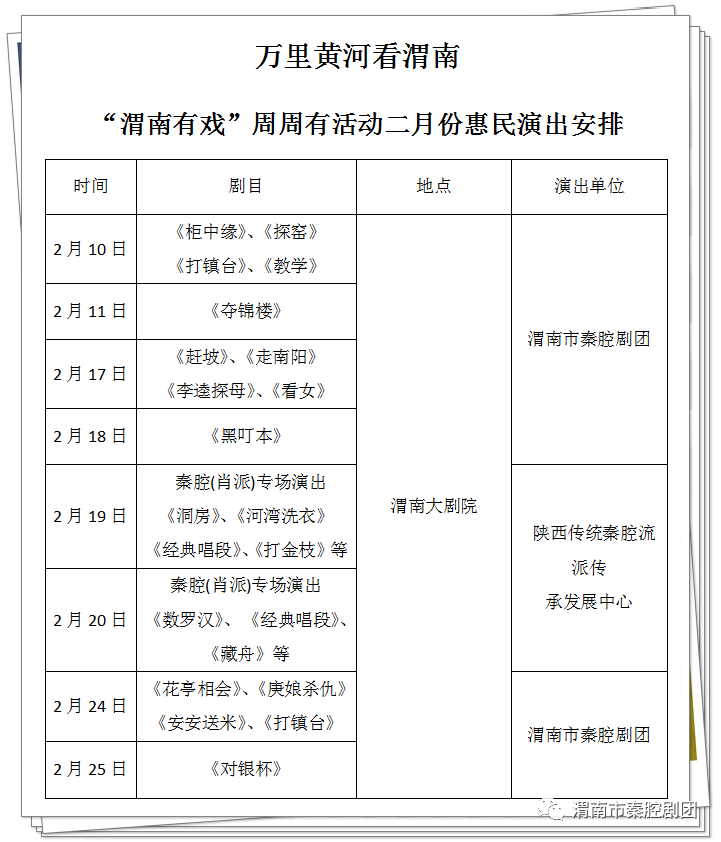 周周有戏!万里黄河看渭南系列活动持续精彩上演。生旦净丑联袂献艺,名家名剧轮番登场!一场场精彩演出即将拉开帷幕,2月,与您相约渭南大剧院,一起领略秦腔的魅力!